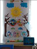 Часы-солнышко, поезд-дни недели, деревья, часы- определители: сила ветра, части суток, время года, осадки; картонные облака.